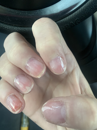 I tried asking her if we could do gel or shellac instead because I know my nails are weak and they are hideous without paint or acrylics, she said,” no because they were to weak it will hurt if you hit them.” I finally got fed up and said,” okay then, just remove them all and I will make an appointment with you some other time,” she then tries to pursued me to get another set of acrylic nails because my nails are too weak. I did not want another set of acrylic nails after the damage she had done to my nail! That would cause more pain than I already have and possible infection! And I know for sure it is not allowed to do anymore work on nails after damage like this has been done, the client needs to be referred to a physician. Oh not to mention, during this whole process, she didn’t have any gloves on.