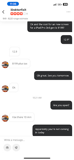 Read moreI would like to start off by saying this was the worst phone repair service I've been to. On multiple occasions the sign would say open but no one's in the store. On the phone they quote me on one price then when I got my bill it was $20 more expensive. That wasn't even the worst part, The screen that was attached to the body was a little finicky.He said that was the glue that needed to be settled. Not even one day later the screen cracked no it did not fall. I believe this was because the screen wasn't mounted properly on the base to begin with.I went to get it looked out again of course no one was there with the open sign on. He said that's not covered under their guarantee. It wasn't my fault that the screen was not mounted properly and there was probably a hairline fracture that I didn't see. Cracked just by touching the phone normally. If I could give 0...
