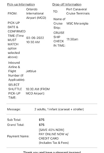 This is a SCAM. REPEAT.....this is a SCAM!!!!! I paid $150 on March 19 for a trip in July. They sent an invoice that was accurate. Then, I called in May and spoke to someone named, "Reese." I told him I needed to add four (4) more people to my party and that dates, times, pickup, & drop locations were all the same. He seemed friendly and knowledgeable. He then ran my credit card, on May 31, for an additional $200. Next, I got another invoice with updated information that looked authentic. However, I noticed, a few weeks later, the second credit card charge said "Davenport School District." The previous charge, in March, said Port Canaveral. I tried MANY times, leading up to my vacation date, to call, e-mail, and text Port Canaveral Quick Shuttle. No answer to any calls or texts. Sometimes, the recording said I could not leave a voicemail. Other times, I was able to do so. I NEVER reached anyone, nor did anyone call back. I did, however, get returned e-mail that were generated automatically. Strangely, on the day before travel, the day of travel, and even on the day I need a ride back....I got messages with invoices.....SAYING THEY WERE WAITING ON PAYMENT. Are you kidding? Fortunately, my credit card company deactivated my card to protect me. Further, I had to call a Lyft both to and from the hotel to the ship.....which was more money spent. Shame on me as I did NOT read the reviews of "Port Canaveral Quick Shuttle" until it was too late. I expect a refund of $350 although I DOUBT I will get it. Furthermore, I hope someone at Google flags this website and takes it off the web. I noticed that other reviewers will contact the Better Business Bureau. I did call the Polk County Sheriff's office to...