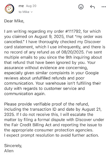 Additionally, they respond to negative reviews by claiming they are lies, or that the reviewer is not a customer, despite my documented order (#111792) and email correspondence. Other Google reviews show a pattern of non-delivery, unprocessed refunds, and deceptive responses to cover themselves.