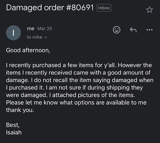 Please enjoy the email received from the owner after claiming my review is a lie. As you can see, he admits that everything I've said is true. This email was sent 13 days AFTER I received the email stating my order was canceled and they claimed my review was "90% untrue"