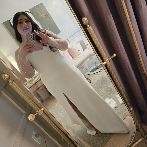 "I want to take the time to say that I found this small boutique on Google. I saw the wonderful reviews and just told myself, 'I want to try seeing it for myself and see if there's anything I like.' I tried going to David's Bridal, but their dresses looked so yellow and outdated. I came here and tried on a handful of dresses and thought, 'Awe, it's good but not quite there.' Cindy listened to my wants and needs for the perfect wedding dress, and she showed me the dress that made me think, 'This is it! I don't need to search any further.' Cindy's wedding dress cost was affordable; I paid around $1,000 for the dress on top of alterations, which cost me around $1,500 in the end. This is quite affordable compared to other alterers, and she's pretty upfront with the cost, so you never get surprises. The alterations were quite simple; Cindy already had a lot of experience, as well as her mother, so they knew right away when I showed Cindy my inspirations from Pinterest boards. She was like, 'Yes, I can do that. Yes, I can make that. Yes, yes, yes!' Wow! She makes you feel special; she doesn't say 'no' to any idea you have. She makes it happen! She has a lot of experience, and she altered my wedding dress perfectly. As you can see, she cut my arm sleeves to be tight on my shoulders; she also put a liner so my skin doesn't show from the inside. She created the beautiful bow that drags a lot during the ceremony and a button to put it up after the ceremony for the reception and dancing purposes. She also added some extra puffs for your feminine goods in the front. I personally loved working with Cindy. I am a bigger girl, so there weren't too many selections, but Cindy makes it happen, and she's able to work with your dreams and Pinterest feeds! I totally recommend Cindy for her fantastic personality and work! She does a great job with alterations, and she is so happy to help out! Moreover, her dresses were the newest edition of that year. You won't regret coming here! Overall, Cindy will make your magical dream come true. I truly felt like a princess and received a lot of compliments. Not only did I love my dress, but my mom, my in-laws, and my husband especially loved it. Thank you for making my dreams come true and allowing me to have my share of a princess moment. We will be back for other dresses for parties in the near future!"