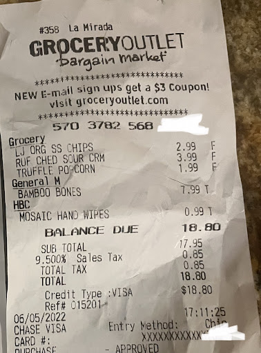 Read moreI just came back from shopping at this store (6/11/22) and I usually enjoy shopping at this store, but today just threw me off. I went today to return certain bamboo bones that I purchased at my last trip to grocery outlet on 6/5/22 which I found out may not be safe for my dog after doing some online research after purchasing them. I entered the store today holding the bones and with the receipt in my bag, picked up the items that I needed without any issue, and went up to the cashier to check out and do the return at the same time (which I’ve done at handful of stores like target to save time without any problems or issues). I told the cashier that I wanted to make a return and showed the receipt to her. She then eyeballed me and stated that I should’ve informed her first that I wanted to make a return before doing any shopping in the store. Not sure where that specific rule is stated anywhere in the store policy (definitely not printed on the receipt from my last shopping trip and I was never informed of such a rule until today), but I said OK. Now I know of an unsaid rule, which I get is for security reasons, but then she proceeded to state that she didn’t see me holding the bones that I wanted to return when I first entered the store. I was taken aback as it felt very accusatory. I told her I definitely had the bones when I entered the store, and I had the receipt in my hand when I went up to her. She insisted on that unsaid rule which I already said OK to, looked at me like I was pariah, and proceeded to check out my items. The experience left me feeling like a criminal and was embarrassing especially when she stated this in front of other customers, even after I showed her the item and receipt which was returned without any issues. See the receipts I posted with this review. Not sure if I as a loyal customer want to return after...