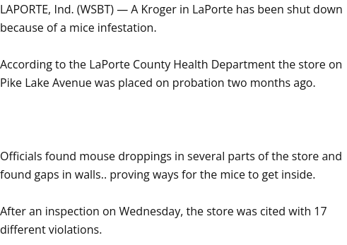 Read moreNot the best Kroger I've been to by any means. Note: many of the photos are NOT of this location. Aisles are tighter than most grocery stores. Ad items are often sold out halfway through the week. Parking lot is small for as busy as the store gets. Workers are mostly pleasant, meat department is most disappointing as they are essentially closed after noon. As LaPorte grows, this location will need to grow, remodel and expand (which isn't possible in a strip mall), or move. It's my go-to grocer in town, but it's not the most pleasant shopping experience overall. Update 3-7: the store was closed yesterday earlier due to major health hazards (rodent infestation). Mice and rat droppings are everywhere. I've worked in grocery long enough to know that all stores have pests, but this store just shrugs its shoulders at the problem. They're more concerned with displays being perfectly straight than they are with cleanliness. When employees drop or spill something, they walk away. Management only cares about what sales numbers look like. The ONLY thing that should concern the leadership is the mice, rats, and other vexes they have. Sales numbers and display perfection mean nothing when the store is closed by the...