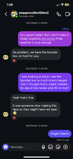 Read moreAbsolutely love their Funko selection and will definitely be coming back to buy some. However, we came for the Pokemon cards and ended up leaving empty-handed and disappointed. For starters one of the guys âworkingâ spent the whole time we were in there talking to someone about politics and general stuff that doesnât belong in a card shop (for a minute we thought we accidentally walked into a recruiterâs office). The only person that helped us was a nice skinny man and he was doing the best he could juggling a couple people at once- at no point did the other guy jump in to help. It was a bit frustrating because we had questions, but eventually we got the info we needed and were told the prices were flexible. I was excited to see one card Iâd been hunting for, but my heart sank after inspecting it and seeing a BUNCH of scratches on it as if it sat loose in a box of other cards and tossed around before eventually going in a binder. I was shocked at the quality and would highly advise that people coming for the cards check the condition before buying. Will come back for the Funkos, will avoid their cards like the plague. Hopefully the customer service will be better...