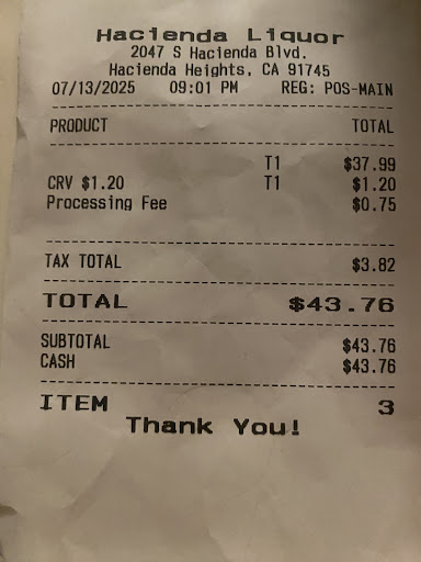 Read moreHacienda Liquor: Buyer Beware! I paid an outrageous $43.76 for a 24-pack of Michelob ULTRA at Hacienda Liquor (2047 S Hacienda Blvd) on July 13, 2025. This is almost double the price of other local stores like Ralphs or Vons, where it's around $23. The receipt only showed "T1" instead of the item name, which is shady and makes it impossible to verify the purchase. This lack of transparency is alarming. I've already reported this to the California ABC and am considering reporting it to county tax authorities. I strongly advise you to avoid Hacienda Liquor if you value fair pricing and...