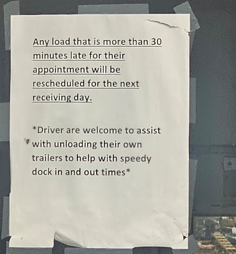 Read moreTheir is a sign posted inside window of driver.check in. It reads "If I'm not back in 5 minutes, just wait longer". This is representative of their thinking. Long unload times just for one pallet. Seriously, telling dispatch to add $500 to my settlement when they see this companies name, or dont book the load for me. To top it off, all this harassment happens in middle of night when I should be asleep. Affects the next day. Press like if...