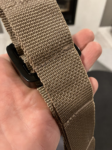 For clarity and simplification, I had opened the stitches, measured the webbing, ran it through the 3-bar belt slide, through the buckle, and pinned everything. I pinned EVERYTHING. READY TO GO. I specifically requested bar tack stitches to bind the webbing and additionally to close BOTH points of the bag where the webbing married the bag (and re-sew the nice binding Mystery Ranch uses on all their seams). No time limit. No rush on the job.