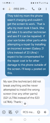 I had a functioning phone with a cracked screen (Mom's). When I called for a quote a gentleman picked up and gave me a quote. I brought it in for repair and found the shop to be staffed with CHILDREN, one in high school and the other in grade or middle school with a backpack. . Little did I know that these were the "technicians" who would be working to replace the screen. They said to pick it up next day, by 3 o'clock. To my surprise the repair was incomplete and they told me there was an "issue" further prying and I found out the "technician" tried to put a S21 screen on my S23, because my phone was actually an S21 and not an S23.