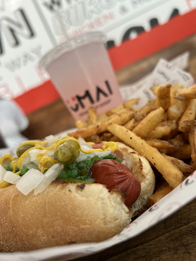 Chicago Chopper: All Beef Hot Dog, Diced Onions, Dill Pickle Slices, Roma Tomato Slices, Pepperoncini Peppers, Dijon Mustard