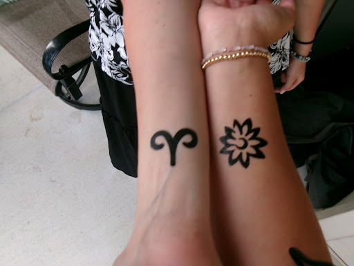 My friend and I went to this shop yesterday, we saw their ad for henna. We were both very excited to get the tattoos. When we went to pick out the designs we wanted they were out of so many of them and had very limited options of their 200 something to choose from. The store says that the tattoos last 1 to 2 weeks and yet not even 24 hours later my friends is almost completely gone and mine is peeling away. We followed all directions given by the people there. My friend got an Aries sign for $10 and I got the flower for $14. These prices were not worth it at all. A complete and TOTAL waste of money. We both plan on going to ask for a refund because of how terrible this is. -10/10 do not recommend to anyone. (Here are some pictures for reference, the first is our tattoos the day we got them and the second and third are today not even 24...
