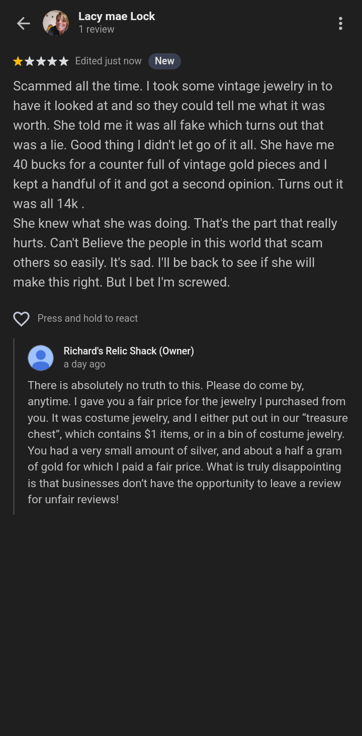 Read moreScammed all the time. I took some vintage jewelry in to have it looked at and so they could tell me what it was worth. She told me it was all fake which turns out that was a lie. Good thing I didn't let go of it all. She have me 40 bucks for a counter full of vintage gold pieces and I kept a handful of it and got a second opinion. Turns out it was all 14k . She knew what she was doing. That's the part that really hurts. Can't Believe the people in this world that scam others so easily. It's sad. I'll be back to see if she will make this right. But I bet I'm screwed.