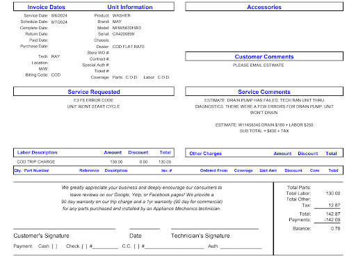 SEE THE INVOICE. I paid $142 for the DIAGNOSIS that I needed a new DRAIN PUMP.