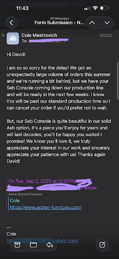 Read moreI ordered the Seb Console from Archer Furniture on June 1st with a quoted delivery window of 4–6 weeks. After the window passed, I reached out and was met with excuse after excuse from Cole Mestrovich, the owner. Over several months, he repeatedly contradicted himself on the status of my order - claiming it was in production, then finished, then preparing to ship - but never provided tracking or proof of shipment.