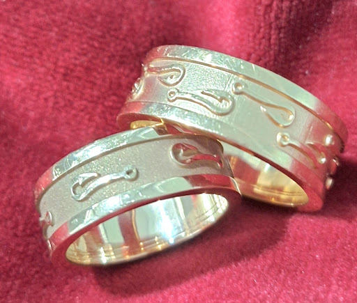 After showing the picture of the ring I wanted made, Kevin had a render to me within days. And the new wedding band to me two weeks later. Just in time for Valentine's. I loved it so much, I had Kevin make one for me out of some old gold I had.