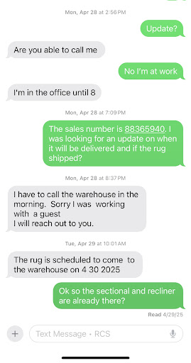 Read moreUPDATE: Still no furniture! Ashley even scheduled a delivery for last Tuesday which we confirmed and we got a date/time window. Tuesday comes & goes - no delivery, no communication from Ashley whatsoever. Many attempted calls & looooong holds, finally reached someone today. Now our 2 missing pieces are backordered AGAIN and denied the scheduled delivery at all (we have the emails/texts)! Absolutely horrible furniture experience, lowered rating to one star now. Maybe someday we'll actually get all of our couch pieces.... My wife and I have very mixed feelings about our Ashley purchase...this might be a long review but hopefully helpful to others in the market for new furniture: