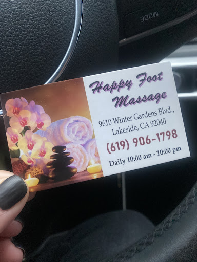 Read moreStarted by asking my preference for massage pressure, and consistently maintained firm/hard pressure from head to neck to feet to legs to arms, to back and butt. I have been the receiver of dozens of massages and today's at Happy Foot in Lakeside was one of the best I have ever experienced and at a very reasonable price. The gentleman demonstrated understanding of pressure and stress points, relentlessly pressured the knots in my back, and gave the best and longest arm massage I have ever had. He used oil on feet, legs and back and followed up with warm moist rough towel, wipe down. I suggest requesting the 90 minute foot massage, which ends up being whole body after an excellent 45 minutes on feet and lower legs. Call first for appointment. Go! Give these people a chance. I had wished I had more smaller bills so that I could tip more than $8, he was...