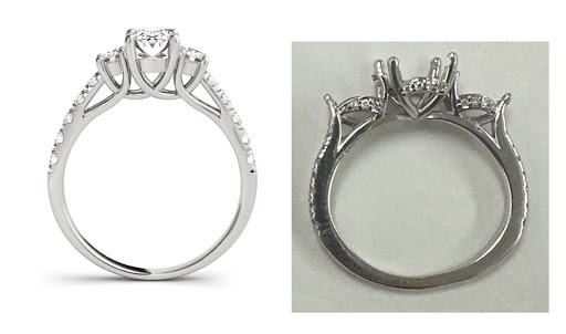 I researched mounting number 82941. A side by side of that setting (according to the top three supplier hits for that setting after an internet search) and my fiancée's setting can be seen below. Mounting number 82941 (on the left) is an oval setting, but it is clearly different from the setting of my fiancée's ring (on the right). The paperwork associated with my ring does not indicate any mounting number for the setting, so I cannot be sure whether the setting my fiancée received was a circle or oval setting. But based on my eye test, the setting appears far more circular than ovular (see the second photo below). Moreover, because the shop owner had told me he bought a setting that clearly didn't match my fiancée's ring, I'm less inclined to believe he ordered a correct, oval setting in the first place.