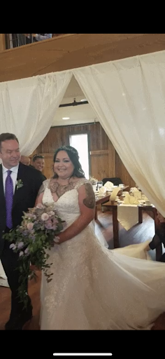 My dress had a complicated bustle, and Michelle did it with ease at the cocktail hour. It was great because I just stood there as she bustled and I had my own little reception line. (see the other photo) It truly made everything seamless and saved my girls from the hassle! Michelle was absolutely wonderful and what I’ve said here doesn’t even fully cover everything she did for us. If you need someone to help make your dress and wedding day less wrinkled, give Michelle...
