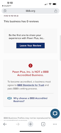 📉 Business Reputation • Yelp Rating: Pawn Plus holds an average rating of 2.1 out of 5 stars based on 32 reviews, indicating general customer dissatisfaction.  • Better Business Bureau (BBB): The business is not accredited by the BBB, and the bureau has noted a lack of response to requests for basic company information.