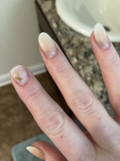 Ā Ā Ā Read moreI had been coming here since last year and always had good experiences. I would get dip. I decided to venture out from my norm and asked for gel ombrĆ©.. Moon did it and she did an amazing job. When I went back, I had another woman (Mindy) who didnāt soak the gel off of my nails despite me commenting that something didnāt seem right in the process several times. She laid acrylic over my old gel. She also burned me with the drill more times I can count to where she broke my skin and actually put glue on my nail beds to stop from burning them any further. About a week after the fill, I noticed on my right hand that you could see dark discoloration from where the acrylic was laid on last to where the old dip was. Two weeks into it, I had one nail fall off and I had a nice wonderful fungus growing underneath. The same thing happened to 4 other nails on the same hand. In 15 years of having my nails done on and off, Iāve never in my life had a fungus. I used to travel 45 minutes for this salon, by the way. So I went here because my friends and I liked it- not because it was convenient. I went to a local salon who was able to remove the old dip out from underneath- it took forever and it was painful considering they had to use a nail tip to practically pry it off. Part of me didnāt want to write this, but if something seems off when youāre getting your nails done- tell them to stop until your questions are answered! She was so quick to wave me off like I didnāt remember what was done to my hands the last time I was there. I also paid $20 less for the āsame thingā that I had done the first time- as in, I paid more for the dip the first time and then $20 less the next time because it was acrylic. Lesson learned. Picture is from 2 weeks out.....