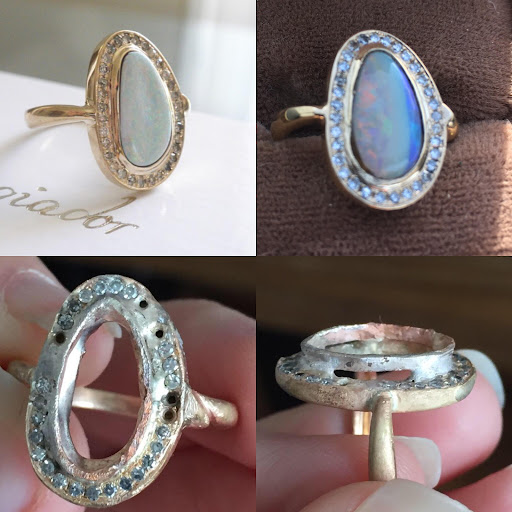 On the picture, top left is the original ring. Top right is the ring after the bezel was mashed and the new opal put in. Bottom is the ring in its current condition and how it was...