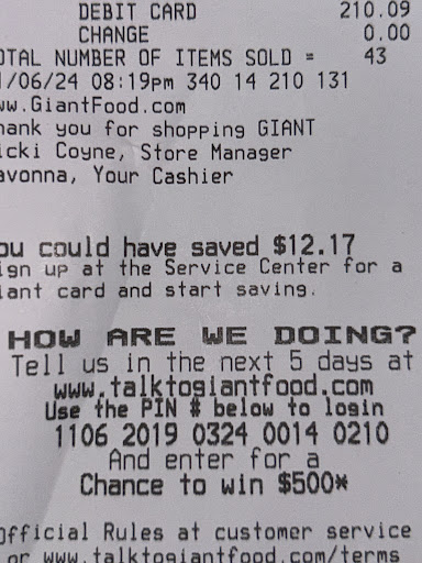 September 16 2023 8:30am I went this morning to this store with my wife to do our shopping for the week. We had our shopping cart full, we proceed to the self checkout and the guy that was monitoring these area with a nasty attitude said, āyou have more than 21 items, can you read???? There is a sign!!!ā So he was right about the sign, I did not read o see it. This maybe because I never have my shopping cart so full before and never had this problem, so anyway, this guy was ruth. We had decided to do only one stop and get everything for once for the week. My wife and I went to the ONLY cashier that was open, three people were in front of us with the shopping carts full as urs, after 20 minutes of waiting we had decided to take only the necessary items and go to the self checkout area. Once we were here, instead of asking to help, an Giant employee just ask if we were not taking the cart full of items that we had left, we said no, they just sadly said ok! Instead of doing something else, like offering to help or something, they were monitoring us for sure.