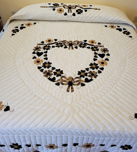 Before I went to this store, a quilt was a quilt. I walked in, spied the Black and Gold/cream Hearts Quilt, and a world opened up to me. I am always on the lookout for personalized and unique experiences to share, but this quilt is a treasure I can have all to myself. Everyone I talked to, including "Linda", and especially "Sheila", was pleasant, organized and excited to share their art. Just in time for my birthday, the gorgeous king-sized quilt arrived, beautifully wrapped and packaged in a way I can use or can continue to store myself (along with a handwritten note of congratulations, and carefully packaged details). The artist's signature is even discreetly listed, so I can know the specialist who created my quilt. Thank you Barba (quilt artist), thank you Sheila (and other sweet team members I spoke with), and thank you Kitchen Kettle Village Quilts in Pennsylvania for making this Washington girl's new dream come true :) (Picture is a...