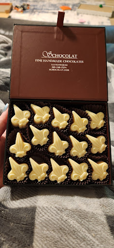 Ā Ā Ā Read moreThese chocolates are so fine. I am cheap, but I will indulge in these $$ chocolates. I love chocolate and cannot recall having something in my mouth that felt like a hand crafted piece of art, perfect amount of chocolate shell to filling, where the proportion could not be more perfect to make each a star. I enjoy the fleur de lis truffles very much, and was even more impressed when my little toddlers were treated like princesses with generous offerings of "chocolate buttons." I seldom review online, so you know this place is worth the stop. It is a little hidden in the back of another store, but well worth it to taste the cinnamon pear caramel sauce, good on warmed brie, ice cream, apples, or....? Definitely would suggest for that special romantic touch, or apparently even out and about...