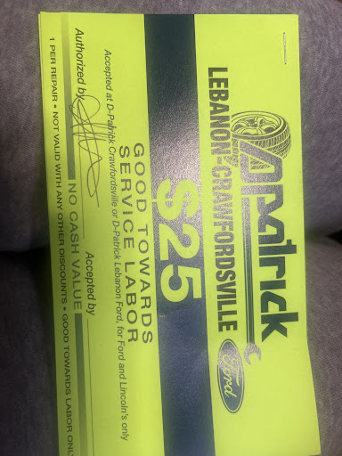 Read moreI am going to share my experiences with D-Patrick Lebanon Ford in July of 2022. I was in the market for an electric car with the gas prices rising and was able to work with this dealership to trade in my F150 for an electric 2016 BMW i3 that was featured on their website. Since I live five hours away in Michigan, I had to make the trip to turn in the F150 and drive the other vehicle home. I started with an internet inquiry which was promptly answered by Jan and she did a great job of providing me with the information and also answering all my questions. After that Taylor reached out to me and did a great job answering my questions and providing me information about the vehicle and process. He went above and beyond responding to text messages and contacted me on several occasions to provide me with updates. Once we set a date to pick up the vehicle, he also provided me with everything I would need in order to make it work on the Saturday in July that I would drive down. Once I arrived at the dealership, I was greeted by staff and was made to feel very welcome. The entire process took less than two hours and once set, I was able to make the drive back to Michigan. I also worked with Owen, the finance manager, who also did a great job explaining all the financial nuances to me. Once I arrived home, I had the car for two days before I had the first issue. On day three of having the vehicle, I came outside to leave for work and found that the car was completely dead. After some troubleshooting and several YouTube videos, I learned that the 12 volt battery in the car had about a 3 - 5 year shelf life. Being a 2016, it was time to replace the original battery. I was surprised that the battery passed inspection when they had the vehicle and would have thought with such low voltage levels, they would have replaced it. I did have some correspondence with the dealership, but at no point did anyone offer to order the battery and have it shipped to me. The car was under a 3000 mile/3 month warranty, but I figured I would have to drive the car back for service, which was a problem because it was completely dead. I did correspondence with the dealership and would have thought it a nice gesture for them to order the 12 volt battery and have it shipped to me, but it never came up. Regardless, I did order the battery for 160 dollars and after several days it arrived and I installed it myself. Car fired right up and has been going strong (knock on wood) since. My experience with Jane, Taylor, and Owen was positive and I appreciated the hard work they put in to making this transaction very smooth. Other than the issue with the battery, it was a...
