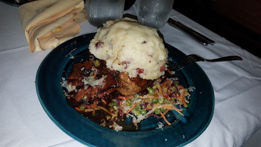 Plates returned for another slice of smoked prime rib and a Shepard's pie. The prime rib was an excellent cut of meat, over salted and over smoked. I think they rushed it out because we got the end piece the first time. The meat had no seasoning except salt. The shepherds pie was a giant baked potato with over salted meat covered in cheese. the pie plate was full of the over salty tasteless gravy. The chef came out and leaned over the table made things odd and asked that I take a bit from the middle.