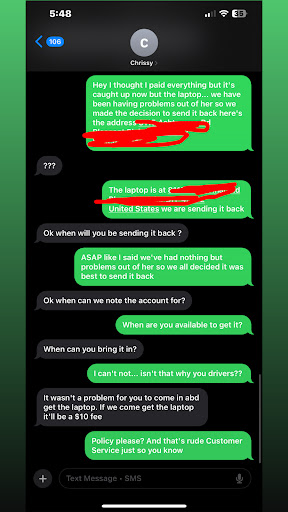 Ā Ā Ā Read moreHorrible employees!!!!! Iām seriously considering just closing my whole account because this is so unprofessional I had a laptop on my account that one of my old friends had they knew it wasnāt at my address. They were OK with that. We had a falling out so we decided it was best for everyone if we just send it back and be done. I messaged them and let them know what was going on and that we would be sending it back this man pretty much demand that I bring this laptop in or Iād be charged $10 fee and I was like I cannot bring it in. I work too much for that isnāt that why you have pick up/delivery drivers? And he is just gotten so rude with me. I called up and I asked who I was speaking to on the messages and he said it was him so I asked him why he was being rude and why am I being charged $10 when Iāve never been charged before he said it was company policy so I asked to see the policy Pretty much refused me of it so I kept asking and he just got louder and ruder and talking over a paying customer and then he hung up on me and yet still hasnāt sent me the policy convenient huh? Get better staff Rent To Own get it together. This is just sad. Iāve been going to your store since I was 14 years old Iām 20 get it together. Get better staff that are going to treat your...