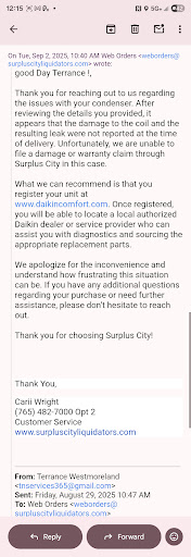 Read moreThis company is a scam and does not stand behind their products or warranty. I purchased a 2.5 ton condenser and coil. The dock company never called me when it arrived, and when I finally picked it up, the unit came in a sealed, non-transparent box with no exterior damage. When I opened it before installation, the coil was bent. After installation, the system wouldn’t pull down to 500 microns, and a nitrogen test confirmed the coil was leaking.