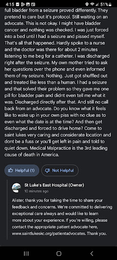 Ā Ā Ā Read moreI went in for Urine Retention. Had a seizure and pissed myself and woke up on the floor. I'm still covered in piss. Tried to reach out to an advocate but no response. Asked for a supervisor and was met with someone who claimed to be in charge while saying "Idk" a bunch and didn't want my mom on the phone with me because she didn't want to be recorded. She tried several times to politely stash away my phone and make sure my mom wasn't listening. She even tried handing the phone to the ER nurses but I got my phone out of one of their hands and very confused faces. I was not recording anyone and my mom was there on the phone because I didnt feel safe after waking up in my own piss and begging for help for 3 to 5 mins to the sound of silence. My mom was listening on the phone and after they cleaned up the pee from the seizure they failed to check for a seizure. If I hadn't had a seizure this staff would've killed me. They lied to me and said I wasn't retaining any urine when my full bladder from a seizure proved differently. They pretend to care but it's protocol. Still waiting on an advocate. This is not okay. I might have bladder cancer and nothing was checked. I was just forced into a bed until I had a seizure and pissed myself. That's all that happened. Hardly spoke to a nurse and the doctor was there for about 2 minutes listening to me beg for a catheter. I was discharged right after the seizure. My own mother tried to ask her questions over the phone and even informed them of my seizure. Nothing. Just got shuffled out and treated like less than a human. I had a seizure and that solved their problem so they gave me one pill for bladder pain and didnt even tell me what it was. Discharged directly after that. And still no call back from an advocate. Do you know what it feels like to wake up in your own piss with no clue as to even what the date is at the time? And then get discharged and forced to drive home? Come to saint lukes very caring and considerate location and dont be a fuss or you'll get left in pain and told to quiet down. Medical Malpractice is the 3rd leading cause of death in America. Update: You can't even report it and still no call back. Is this some sick idea of a joke? Edit: Turns out I have a severe spinal injury. I went to Advent health in Overland Park Kansas afterwards and recieved quality care, a urologist, social worker, and neuro specialist. Im getting surgery and still have retention issues. Thank God Im not at St. Luke's anymore. Dont go here for emergencies.