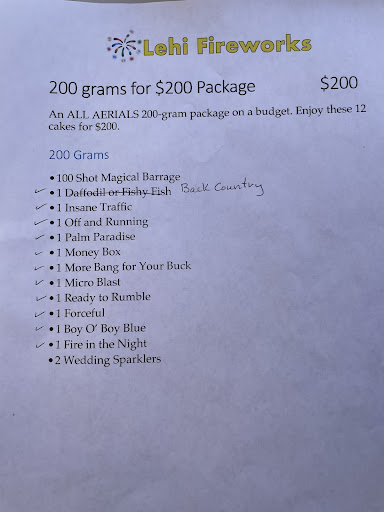 This is my first year purchased from Lehi Fireworks and my experience was exceptional. First of all they had a really good, high quality and special selection which you don't find at those generic tents. They have the big things and also the kids stuffs that my 5 years old love. Second is the price. Their price is significantly cheaper than the others yet they are high quality fireworks. One of the snow cone firework we were surprised how pretty and the duration of it. Third, they have really friendly easy going customer service. They took the time to show us the videos of the fireworks and answered all the questions that we had. My shipping experience was amazing and we actually just went back to purchase more for the Pioneer day. For sure we will go there to get our fireworks...