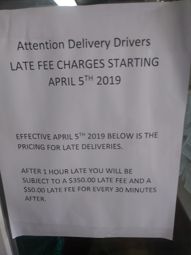 Notice! $350 late fee for first hour, and $50 for every 30 minutes after the first hour. Yeah I know it’s ridiculous right? Better cancel that load if you don’t have enough hours. Or when you think shipper will take 2+ hours cause it’s not worth it. So I’m dropping it down to 3 stars because they should know about the hours of service! Plus truckers should also charge them for detention, the time the hit the dock. Ain’t nobody...