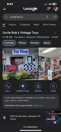 Read moreWe were browsing the store for the first time and looking to make a purchase. My daughter was touching one of the toys and the owner came out and spoke to her, a young child, very aggressively, very unnecessarily it and snatched it out of her hand. He startled her, though she wasn't damaging his merchandise. She tried to say something but he cut her off abruptly. After making a small purchase on my way out, I politely said that he could speak nicer to children, he got loud with me, told me I don't need to come back, and then said I "was trespassing" very aggressively. This is the kind of local store we love to support, but there is a much nicer, better merchandised and FRIENDLY vintage toy store in Elizabethtown that doesn't smell like pot and decay! If you treat customers and CHILDREN like garbage you get a bad review. This could have been handled...