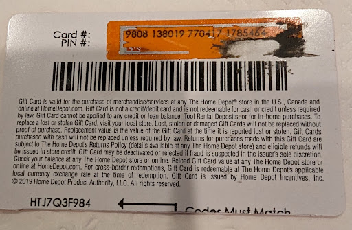 Read moreIf I could give zero star I would! I went shopping today using a $100 Home Depot gift card at the Rehoboth store #1604. I could not remove the coating covering the pin number so I asked for assistance at the checkout and customer service. By the time 4 employees tried to remove this coating the pin number was completely erased ( see photo). No one knew what to do next and when I asked for the store manager (Lindsey Fey) I overheard him tell the customer service representative "tell them they are out the hundred dollars". You mean to tell me that a billion dollar company has no way of telling where a gift card was purchased and for how much!! As a long time customer I am appalled at this totally unprofessional handling of this matter.