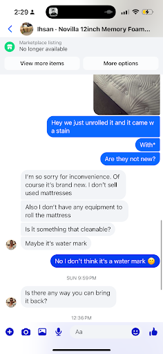 Found this place through Facebook, at first I was skeptical but the prompt responses made me go and purchase a mattress, upon arriving to the furniture store that’s located inside a shopping mall the store was unattended I wandered looking around, mattresses on the floor and not the best looking store but I stayed after choosing my mattress the owner gave me a different price than what it was listed on Facebook he told me that the price he gave me was for a smaller mattress(at this point I should’ve left !) but I still stayed and finalized my purchase, he did help me loaded into my car which was amazing ! After arriving home we opened the mattress and found it with a medium sized yellow stain, I messaged the seller and said all his mattresses were ‘new’ I asked for a partial refund and he said he would only exchange it but I had to bring it back… supper disappointed because this was for a guest room which obviously I cannot use, and now I have to go buy...