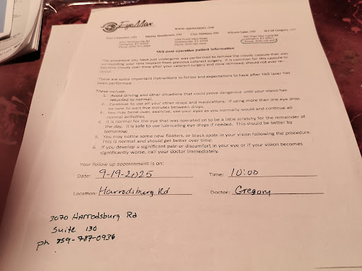 Your temperature will be taken upon being let into the building, and asked if you have have had any symptoms recently, before admitting you. The staff and Dr. Gregory who work at this location are excellent, and as always. You get accustomed to being treated well when visiting this or one of EyeMax's other locations! Many good doctors and staff, but small enough to still remember names! :)