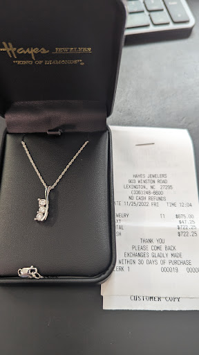 Read moreI have bought from Bruce Hayes and his fine staff for years and have always received excellent service. My wife has many pieces of jewelery that she now owns that I purchased from Hayes Jewelers Lexington, NC and she will tell you she enjoys them all. I also have started giving my granddaughters custom designed pieces that I have had Bruce and Zach make for me at Hayes Jewelery in Lexington, NC. My family buys lots of pieces there also. For the Best in Service make one call that does it all. Call on the fine folks at Hayes Jewelers for all of your jewelery needs from custom pieces to already made designs which they have plenty of in the store. And speaking of custom pieces of jewelery if you can dream it they can make it. Service second to none anywhere to be found.do what I do and make the trip and speak to the friendly staff at Hayes and let them help you design a custom made ring, bracelet or necklace for you. I even have my brother in law and his wife and kids in New Hampshire coming down to buy from Hayes. If you will travel that far then you know you must be getting a Great Deal and...