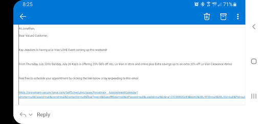 My husband and I found an adorable engagement ring in the mountains. It was the first one I had seen in our 18 years that really spoke to me. I went to Kay jewelers in hopes of getting it sized and cleaned so that the rings beauty could once again shine through and I could wear it with my simple gold band. We worked with Brooklyn. Her enthusiasm was refreshing and the intake process for the service requested was excellent. I thought we had finally found our jewelry store. Boy, was I wrong. Dropping the rings off was the last time we heard from Brooklyn. She made promises she could not keep. She claimed she would send emails with service updates, etc.. This never happened but we were flooded with promotional emails from Kay. Nothing more. My ring arrived back to the store about a month later and I still had to call to check on the status. It was back in the store on Oct. 31st. I had to call yesterday to check on the status and pick up. The service department did a great job restoring my rings. The only complaint I have with them is that they removed so much gold from my original wedding band. There is no excuse for it. It is soooo thin now and nearly cuts the skin when putting it on. Removing that much gold was not necessary as my wedding band was already sized for me and it feels like Kay jewelry and their associates simply takes advantage of their customers.