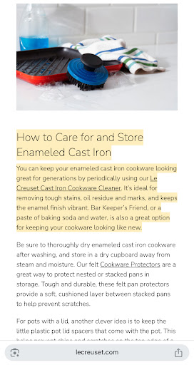On 4/19/25, we had government business in the area and decided to stop by the store to return items we purchased for gifts to Chicago relatives, that decided they didnât like the color. While there, I saw the LC cleaner and had described I used Bar Keeperâs soap. Muriam interjected and combatively told me, that I am choosing to ruin my LC pans using Bar Keeperâs instead of LC cleaner and void my warranty, with a tone and a face. I told her that I donât purchase LC for the warranty necessarily because 1 of my pots cracked in the oven and it wasnât replaced, and she automatically told me it mustâve been thermal shock, as if Iâve never owned an LC cast iron in my life (Iâve had 120 pots by the time this crack happened). I disengaged and instead spoke to my partner in French, because I was so taken aback by the way she responded. Weâve had LC dutch ovens for 2 generations in my family, all have used Bar Keeperâs and no damage. In fact, I worked with LC marketing decades ago, and I know Bar Keeperâs is one item that was officially recognized as a safe cleaner for LC. I attach a screenshot of the website stating this. But thereâs no point reasoning with someone blindly talking to me.