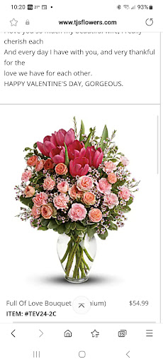 EXTREMELY disappointed in the way I was treated with my order. The flowers I order from the t.j's was not the crappy arrangement that was delivered today for valentine's day and also for our 17th wedding anniversary..... first off, if you are going to accept payment and then as a company hand off the order to another company, I should have been notified, or stated on the company site..Let me explain what I was told:: When ordering flowers from t.j's in licking and it's going to salem, then what they said was that they actually give the order to bee hive to fill for salem area. I was looking for the so called quality from t.j's not from any others, so in short my wife got shafted while my money was taken for an extremely less quality, where it looked like it was thrown together, and after talking with someone from t.j's and sending them a picture of what my wife received, and the person from t.j's agreeing that it was of terrible quality, they explained that basically there was nothing they could...