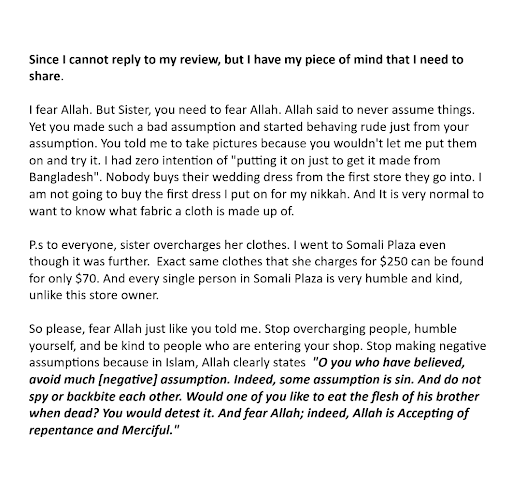 Ā Ā Ā Read moreIf I could give a zero I would. Horrible experience! For starter I went to support my sister, I am a Christian she placed clothes me I did not ask to wear. And was extremely aggressive with focusing becoming a Muslim. I was kind through out this interaction. I was up charged and paid 280 because as she point out of my YSL bag, and was never provided a receipt not even by text as she claim she would. Or saw the price tags on any item. I turned the mechanic the next day and she refused to take them back. When I disputed with my bank some how she now had a receipt and said she was willing to work with me but did not do that when I came the next day to return the merchant. I will be returning them again and let see how friendly and willing she is to work with me since thatās what she told the bank. Absolutely disgusting behavior...