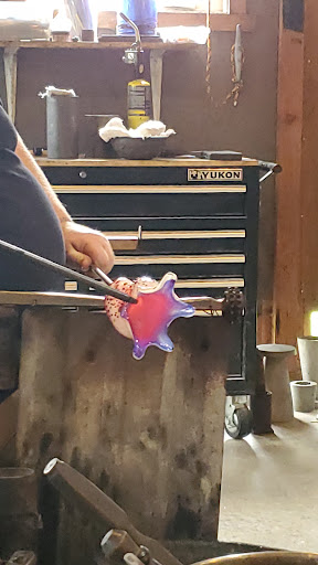 Treasure was the artist the THREE times we stopped on our current visit to the area (we're from Auburn WA). On our 1st stop we watched Treasure create a beautiful seashell. I found a gorgeous vase that, if I hadn't bought it, I would have regretted it. The best part was watching Treasure make a small pumpkin for me (2nd visit). Took all of 8 minutes! Or as he said, "8 minutes and 24 yrs". 3rd visit was to pick up my pumpkin. I've bought many of these pumpkins at glass shows, but this is the 1st that I chose the colors and WATCHED it being made. Extra special!!!