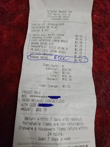 Read moreI went to return (on Sept. 19, 2024) the banana bread (that tastes horrible) I got off the shelf and the lady at the cash register says "but it's opened". No where on the receipt does it say an opened item can't be returned. She calls over a male employee (possibly owner) and he was very nasty and rude. He angrily says the same its opened and I told him read the receipt and for future purposes to fix the return clause on his receipt if they don't want to do refunds. I then told him that he can keep the money and just let me exchange it to make things easier and he says no because I might return that too. I took the refund and will not be returning to that store. They are not customer service friendly at all yet your customers are what keeps you open. I hope more people wake up and realize the way those people are. It's not the first time I've heard they are...