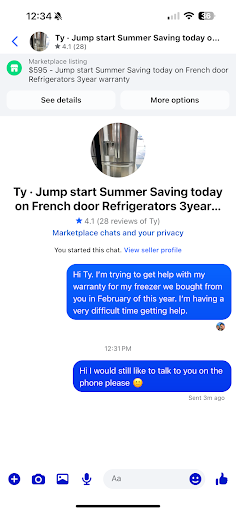 Read moreEDIT: After reaching out multiple times asking them to make things right, Ty has chosen to ignore my messages. I would not tell my worst enemy to do business here. I have contacted an attorney looking for next steps and to see what can be done so we can move forward and have a working fridge :( Great customer service and communication you have there, Ty.