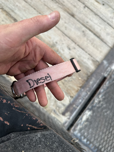 I have attached pictures of where Camp Bow Wow wrote in sharpie on our collar. Along with where it has his name and our phone number on the clip of his collar. I also attached a picture of the piece on his collar where we run through the strap to his service vest. The collar itself was made to be a a three in one, to where we can use the clips on the collar to clip onto his service vest, or we can run the strap through the piece on the side, and or he can wear the collar by itself.