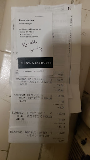 Read moreOriginally fit at the Selma store. After a few weeks I was notified my rental was ready. It was not sent to the Selma store. Sent to Round Rock store. No big deal right? Came in two days later at the Selma store. But guess what? Doesn’t fit. Both too small, slim fit for some reason which wasn’t the original order. Sent off for the right stuff. No big deal right? Another round of replacements to Round Rock. Again. This time literally the day before the event. I asked a person in the bridal party to pick up my stuff as I’m traveling in the day of. No big deal right? This time I was given two separate rentals, two shirts, two jackets. All wrong size. Slim when it was supposed to be regular fit on one set. Too small on the other set. And guess what else? The tags on the garment bag had the right sizes. The workers didn’t verify what was actually in the garment bags. I even asked the woman at the Selma store, since my order had already been messed up twice, to call the Round Rock store to verify accuracy. Do not rent from Selma, Round Rock or Men’s...